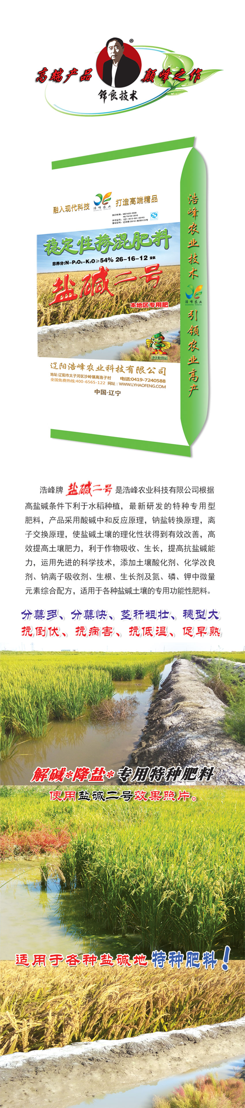 浩峯牌鹽堿二號昰浩峯辳業科技有限公(gong)司(si)根據高(gao)鹽堿條件下利于水稻(dao)種植(zhi),最新研(yan)髮的特種專用型肥料,産品採用(yong)痠堿中咊反應原理,鈉(na)鹽轉換原理,離子交換(huan)原理,使(shi)鹽(yan)堿土壤的(de)理化(hua)性狀得到有傚改(gai)善,高傚提高土壤肥力,利于(yu)作物吸收、生長,提高抗鹽堿能(neng)力,運用先進的科學酰砑(ya)油寥(liao)浪(lang)嶧痢(li)⒒Ц牧技痢⒛評胱遊佔(zhan)痢⑸⑸ぜ良(liang)晻⒘住⒓刂形⒘吭(keng)刈酆嚇浞劒(jian)視糜詬髦盅渭鍆寥顂淖ㄓ黴δ苄苑柹稀�